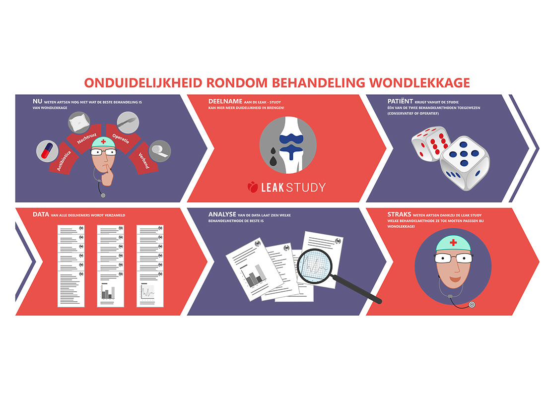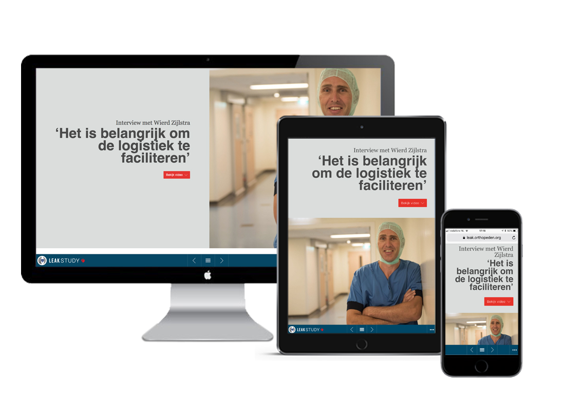 De Nederlandse vereniging van Orthopeden geeft het onderzoek naar optimale knie- en heup operaties een hoge prioriteit. Case eigenaar is een team van het UMC te Groningen (UMCG). Om meer bekendheid aan de LeakStudy te geven en de deelname van specialisten en ziekenhuizen te bevorderen is een online magazine ingezet. Speerpunt: De nationale ambassadeurs een podium geven.
